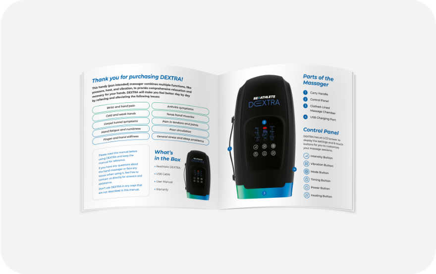 Discover the ultimate hand rejuvenator, providing soothing relief, enhanced flexibility, and relaxation with DEXTRA hand massager. 6 levels of acupressure Vibration & heat functions Portable & cordless